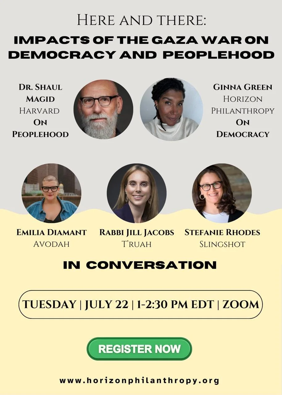 This is bad for the Jews, and bad for democracy.In this 90-minute conversation, we will explore with Dr. Shaul Magid, Harvard Divinity School Professor of Modern Jewish Studies and Horizon principal Ginna Green, the current states of U.S. democracy and Jewish peoplehood, and the impact of the Gaza War on both. This will be followed by a panel conversation with Emilia Diamant of Avodah, Rabbi Jill Jacobs of T’ruah, and Stefanie Rhodes of Slingshot sharing their assessments of the Jewish community, how the Gaza War has shifted the landscape, and how we can cultivate a peoplehood that includes all of us, no matter where we live, what we believe about the State of Israel, or how we define antisemitism.